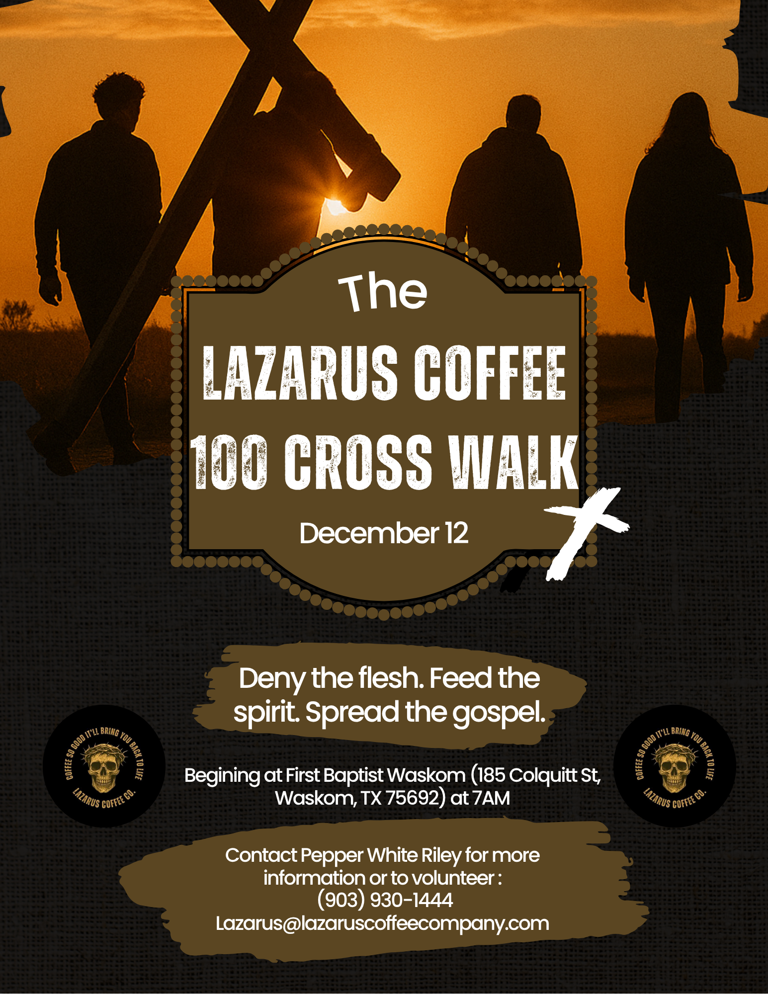 The 100-mile walk is a community faith challenge on December 12th 7AM - 13th 10PM, where we’ll walk from First Baptist Waskom to Cypress Valley Bible Church—25 miles—and back, twice. You don’t have to finish all 100 miles, but we do want everyone to push themselves enough to lean on the Spirit and see God meet them in their weakness. We need walkers at every stage to encourage those striving to finish the full distance, and support vans will follow for anyone who needs a break. And if walking isn’t your role, we also need volunteers to help with rides, hydration, safety, and cheering people on. Every person—walker or volunteer—helps make this experience possible.